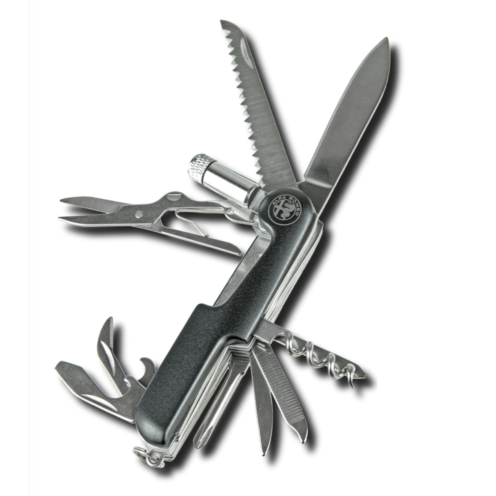 Den 14-i-1 lommekniv fra Alfa Romeo er en ægte alt-i-én-løsning. Fra sav til LED-lys og fra flaskeåbner til skruetrækker – alt samlet i ét kompakt og let værktøj, der altid er nyttigt.
