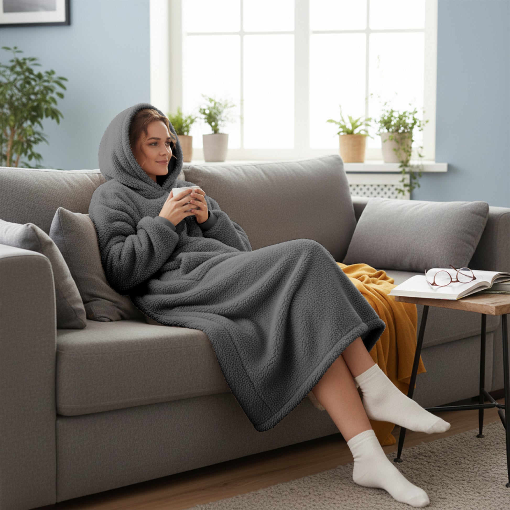 Oplev en ny grad af varme og luksus med vores premium tæppe-hættetrøje i overstørrelse. Omhyggeligt fremstillet af en højdensitet 300 gsm teddy fleece, tilbyder denne hættetrøje en usædvanlig blødhed og isolering. Det er ikke blot et stykke tøj; det er et varmt knus, du kan tage på – perfekt til de øjeblikke, hvor du har brug for ultimativ komfort.