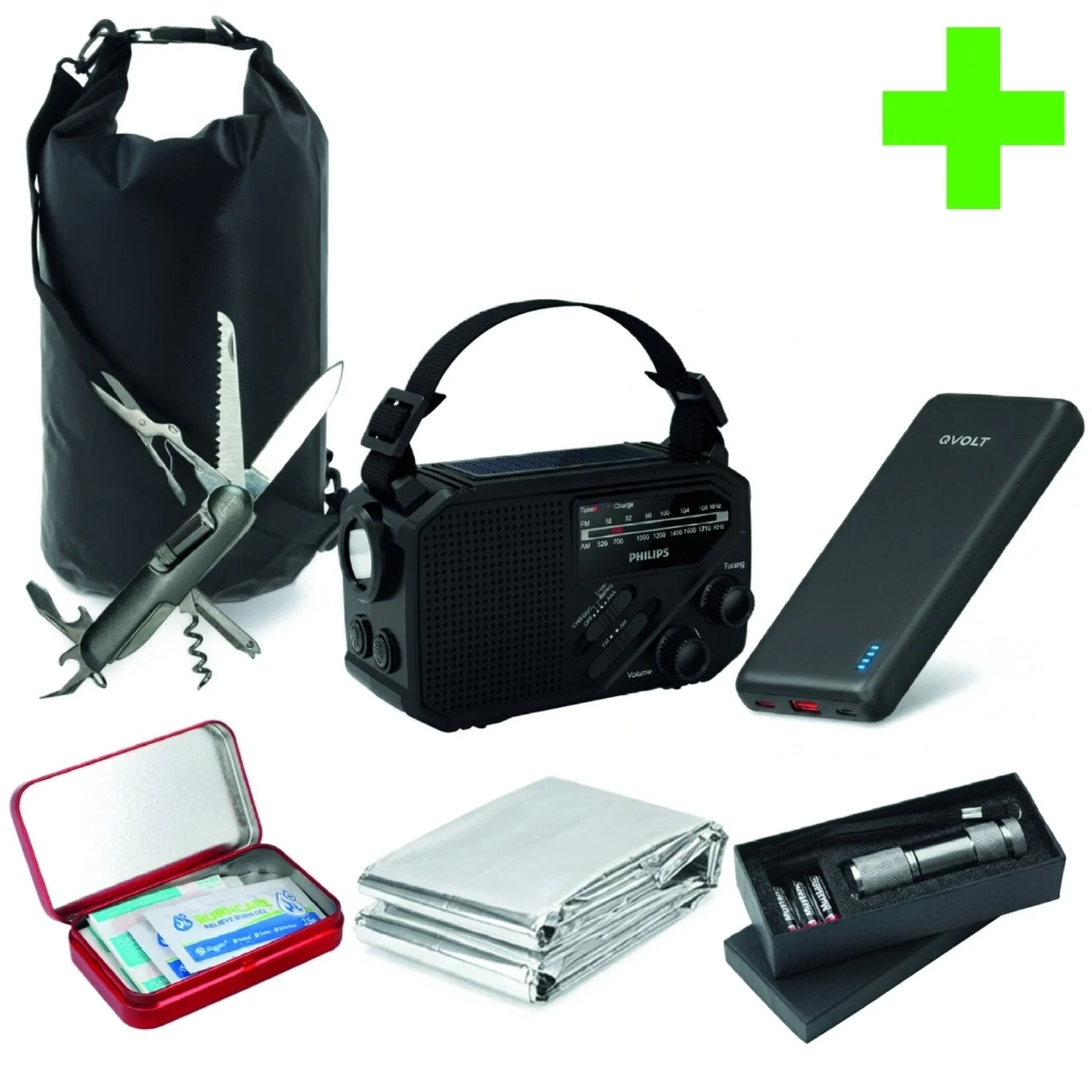 Philips TAR1609 nødradioen er hjertet i dette sæt. Uanset om der er strømsvigt eller storm, kan du holde dig opdateret via AM/FM-radioen. Den indbyggede lommelygte med SOS-blink giver lys og ekstra sikkerhed. Takket være solpanel, USB og håndsving kan radioen altid oplades – selv efter mange timers strømafbrydelse.