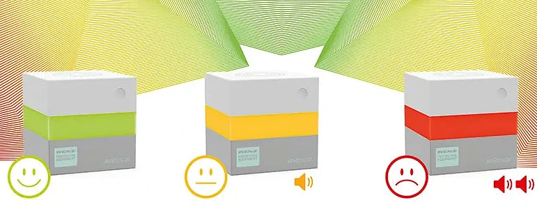For meget kuldioxid (CO₂) i indendørs luft påvirker både koncentration, fysisk velvære og helbred. AIR2COLOR fra RENZ fungerer som et intuitivt “CO₂‑trafiklys”, der viser luftkvaliteten i rummet i realtid. Den 360° synlige lysring ændrer farve fra grøn → gul → rød, så alle kan se, hvornår det er tid til at lufte ud. Aktiv og målrettet ventilation reducerer aerosoler i luften og kan samtidig have en positiv effekt på energiforbruget.